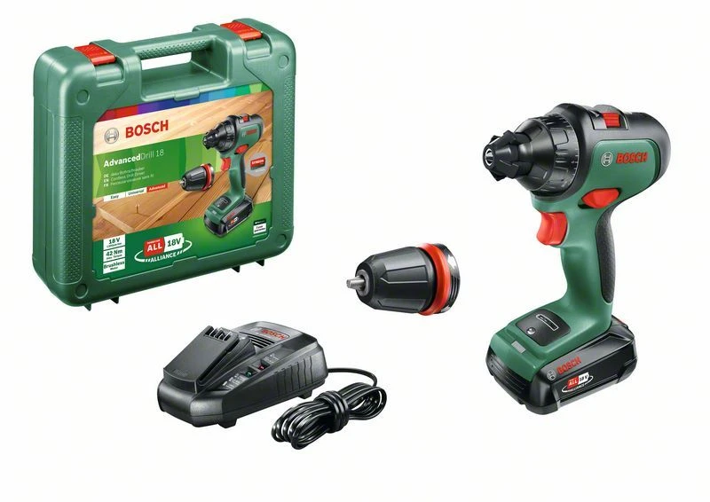 De Bosch accu klopboorschroefmachine AdvancedDrill 18 is erg compact en licht in gewicht dankzij de borstelloze EC motor. Het toestel is eenvoudig te bedienen dankzij de geïntegreerde versnellingskeuze en de gepatenteerde One Touch elektronische schakelaar.
