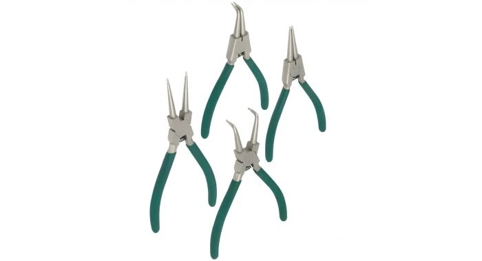 Borgveertangenset, 4-delig. Tangen met antislipgreep, inwendige veer en gepolijste vernikkelde bek, recht (180 mm) en gebogen (170 mm), voor in- (conform DIN 472) en uitwendige (conform DIN 471) borgveren van Ø 19 tot 60 mm. Wordt geleverd in kunststof bewaarcassette met zichtvenster.