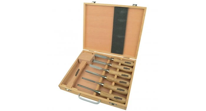 Houtsnijset 7-delig voor alle soorten creatief houtsnijwerk. Steekbeitel 6 + 12 mm, schuine beitel 12 mm, guts recht-hol 6 + 10 mm, guts hol 16 mm en blokhamer in houten kist.