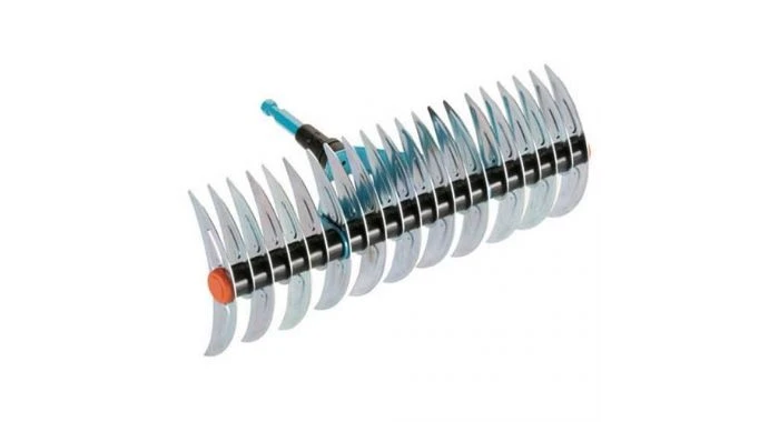 Gardena Combi-System-verticuteerhark. Spitse tanden voor het verwijderen van mos en grasresten. Ronde, dicht op elkaar staande tanden voor het bijeen harken van loof, onkruid en stenen. Speciaal gevormde, verzinkte messen. Werkbreedte 35 cm. Geadviseerde Combi-System-steel 180 cm.