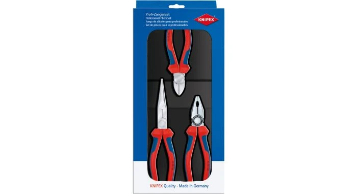 Aantrekkelijke verkoopsverpakking met ZB-gaten. Materiaal: stabiele kartonverpakking, bedrukt Model: Tangen met tweekleurige meer-componentengrepen. Knipex Montage tangen set 3 delig